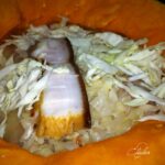 Acum, din experienta avuta va sfatuiesc ca sa opariti inainte varza de a impacheta sarmalele (daca puneti varza murata si va sfatuiesc sa puneti varza murata… pentru ca se imbina excelent gustul acru, de varza murata, cu dulceagu de la dovleac)