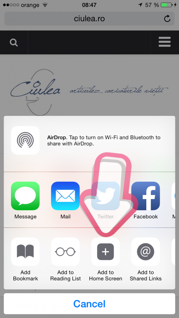 - Apăsați butonul de share, iar de aici alegeți opțiunea Add to Home Screen.