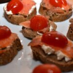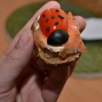 In primul rand am taiat cornul feliute, dupa care l-am uns cu crema de branza, peste care am pus feliute de somon. Rosiile le-am taiat in doua pe lungime si le-am mai crapat apoi de la jumatate (ca sa redau forma aripilor), dupa care le-am pus si pe acestea peste paine. Maslinele le-am folosit pentru desenarea formei de buburuza.