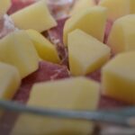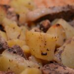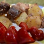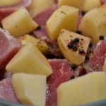 Dupa ce am taiat carnea si cartofii cubulete, le-am pus alandala intr-un alt vas de yena, intre timp am pornit cuptorul, si chiar inainte de a pune vasul la cuptor, am golit vinul amestecat cu condimente peste carne si cartofi… am adaugat atat vin, incat sa ajunga pana la jumatatea cantitatii de cartofi si carne.