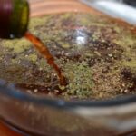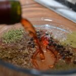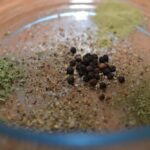 Prima data, am scos un vas de yena, am pus si am pus in el: sare, piper, rozmarin, patrunjel uscat si oregano. Pentru ca mi-a mai ramas putin vin, l-am turnat peste condimente.