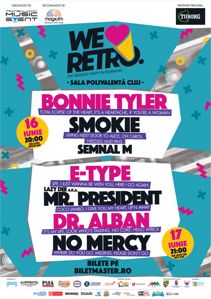 Bonnie Tyler, Smokie, Mr. President, Dr. Alban, No Mercy și E-Type vor concerta la Cluj-Napoca! Luna iunie va fi gazda artiștilor care au definit muzica anilor ’80 și ’90. Pe 16 și 17 iunie 2016 generația noastră, a celor de 25-45 de ani va avea ocazia să își reamintească de probabil cea mai frumoasă perioadă a vieții: de vremea primelor discoteci, a casetofoanelor cu luminițe și a petrecerilor cu colegii de școală. Atmosfera celor mai marcanți ani din istoria recentă a României va fi recreată în detaliu prin decoruri speciale la ”We Love Retro”. Am 3 invitații duble, haideți cu mine la We Love Retro – The biggest party in Romania!