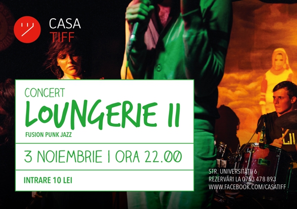 Sambata, 3 noiembrie 2012, pentru prima data in Cluj o sa avem la Casa TIFF un concert de fusion punk jazz sustinut de membrii Loungerie II, incepand cu ora 22.