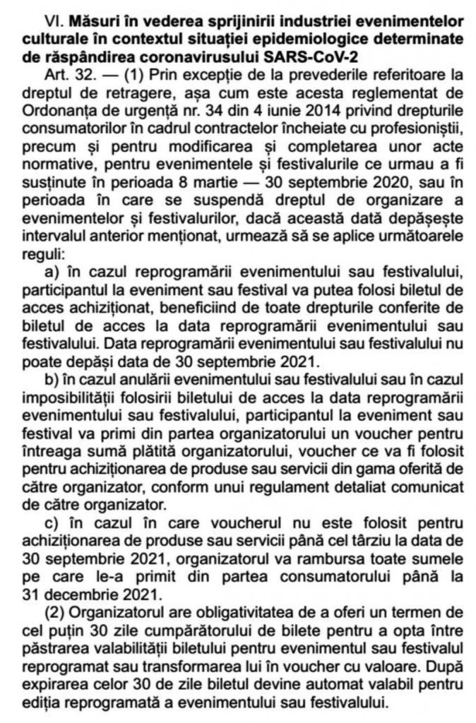 Adina Țimonea, jurist de profesie, mi-a răspuns: Ordonanța nu interzice explicit organizarea evenimentelor într-o perioadă anume de timp, dar reglementează procedurile aplicabile în cazul reprogramarii. În schimb, din HOTĂRÂREA nr. 24 din 14.05.2020 privind aprobarea instituirii stării de alertă la nivel național și a măsurilor de prevenire și control a infecțiilor, în contextul situației epidemiologice generate de virusul SARS- CoV-2, Art.1 Începând cu data de 15.05.2020, se declară Starea de alertă la nivel național, pentru o perioadă de 30 de zile reiese că actul este reglementat pentru următoarele 30 de zile.