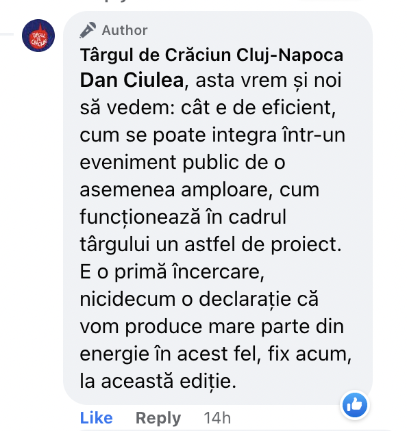 Specialitatea noastră sunt parcurile de mari dimensiuni, cu puteri instalate de peste 1.000 kWp. Acum, în Cluj-Napoca, la Târgul de Crăciun, este prima excepție de la această ”regulă” de dimensiuni, pentru că am văzut în Târg un canal de transmitere a unui mesaj în care credem: acela că folosirea energiei verzi, regenerabile este unul dintre instrumentele prin care putem să sperăm la un viitor mai bun, sustenabil, pentru copiii noștri. Este parte din misiunea pe care ne-am asumat-o și acum am avut și oportunitatea să o comunicăm în spațiul public, la un eveniment la care participa întreaga comunitate clujeană, în orașul unde avem sediul central.
