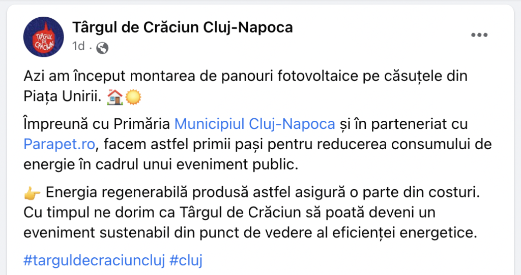 20 de căsuțe ale expozanților participanți la Târgul de Crăciun din Cluj-Napoca au fost ”decorate” cu 20 de panouri fotovoltaice, oferite gratuit pentru utilizare (montaj, demontaj, transport, mentenanță, etc) și doar pe perioada târgului (nu rămân în proprietatea nimănui, se întorc la furnizor), de Parapet.ro, în urma unui contract de parteneriat cu organizatorul Târgului, societate privată la rândul său. Acesta este primul pas în direcția organizării de evenimente publice sustenabile din punct de vedere energetic, indiferent de anotimpul în care se desfășoară. Scopul acestei acțiuni este conștientizarea importanței utilizării energiei regenerabile și folosirea unor sisteme care generează energie în mod sustenabil.