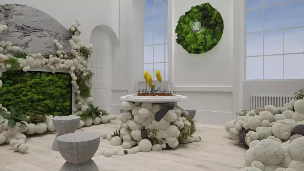 Folosind o varietate de tehnici de reciclare, echipa Vatra Verde a refolosit mai multe tipuri de deșeuri precum hârtia, pulberea de piele, pluta, cânepa, rumegușul pentru a crea volume, spații și obiecte omogenizate printr-un lipici biodegradabil pe bază de miceliu.