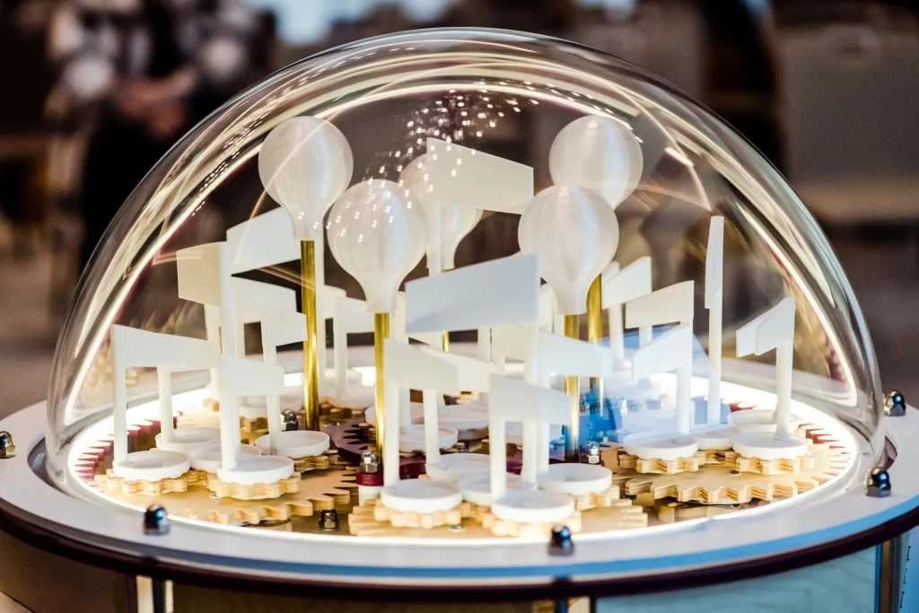 În cadrul instalației noastre, energia electrică consumată poate fi produsă de către spectatori, interacționând cu sculptura noastră cinetică.