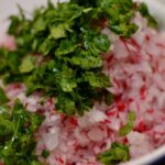 So’, am luat 3 legaturi de ridichi, pe care le-am spalat, taiat si dat prin robot (stiu, am fost lenes, dar am vrut sa le tai mici). Am cumparat din piata si ceva patrunjel (intre noi fie vorba, patrunjelu’ mi se pare exceptioanal) pe care l-am taiat mare… nu m-am chinuit deloc sa-l tai feliute.