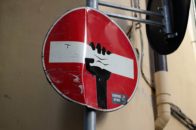 M-am interesat putin si am aflat ca persoana responsabila de simpaticizarea semnelor de circulatie e un artist francez, Clet Abraham, care s-a mutat de ceva vreme in Italia