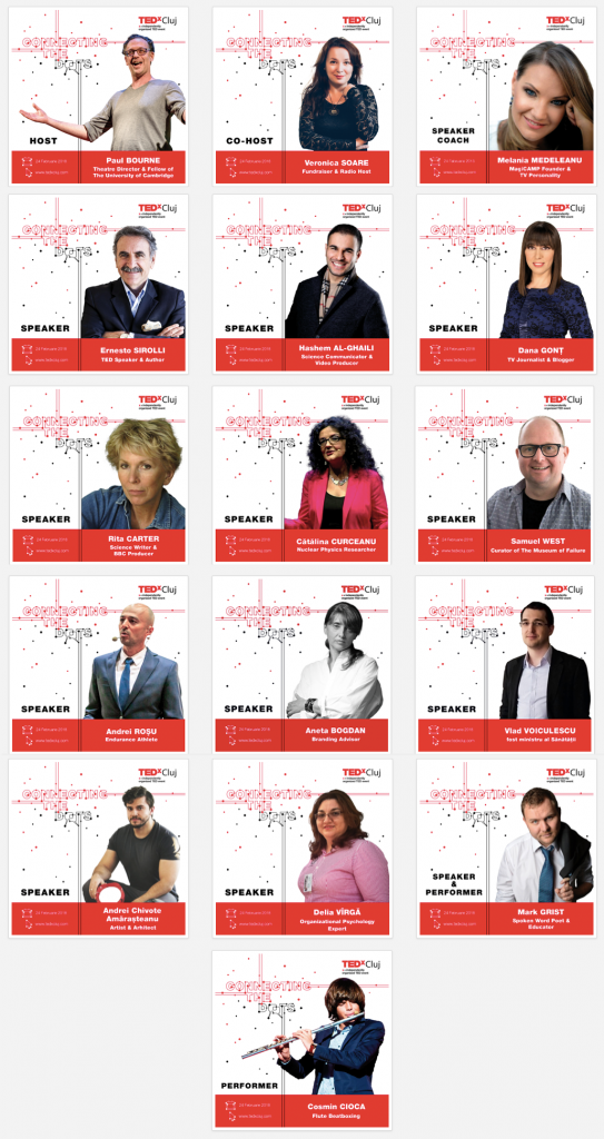 În cadrul conferinței de anul trecut, TEDxCluj – Going Beyond, am fost extrem de impresionat de Paul Bourne, Veronica Soare și Melania Medeleanu. Anul acesta Paul este host, Veronica co-host, iar Melania este ”antrenorul” speaker-ilor. Sunt extrem de încântat să-i reîntâlnesc, mai ales că pe parcursul anului am avut ocazia să mai interacționez cu Paul și Veronica. Cine știe, poate anul acesta voi avea oczaia să interacționez și cu Melania Medeleanu, sunt convins că am foarte multe de învățat de la ea.