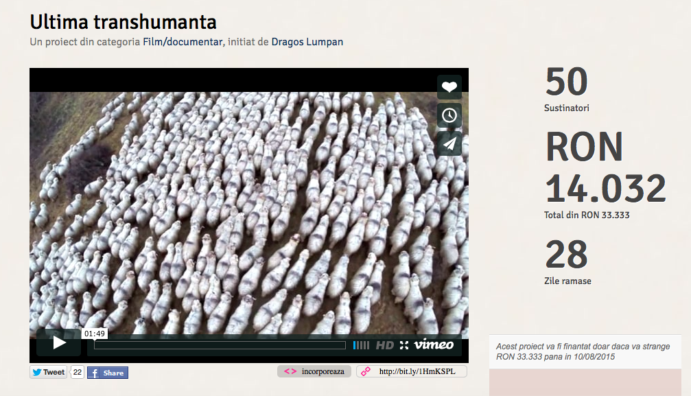 Pentru realizarea acestui documentar, mai e nevoie de fonduri. Campania de crowdfunding inițiată pe crestemidei a ajuns la 33% target. E nevoie de minim 100% pentru ca Transhumanța să intre în posesia fondurilor (finanțarea pe platformă e totul sau nimic) și să se demareze procesul de post producție al filmului.